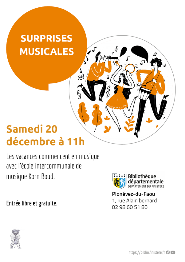 Surprises musicales Surprises musicales Le samedi 20 décembre 2025 de 11:00 à 12:30 Ical Public Tout public Lieu Antenne du Pays COB - Plonévez-du-Faou Voir le détail de l'événement Tags Concert