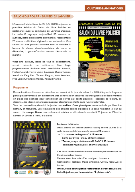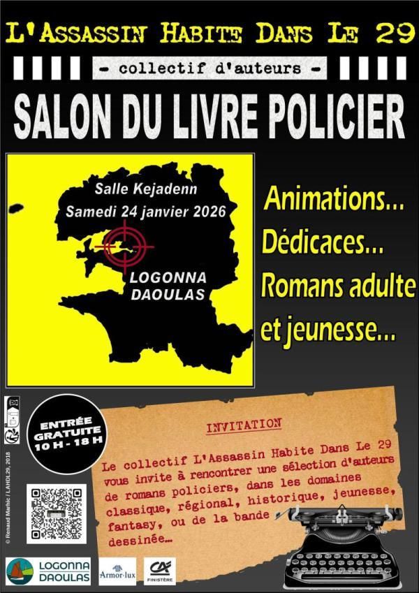 Salon du livre policier Tags Rencontre avec un auteur Lecture Jeu Salon Détails des prochaines sessions Le samedi 24 janvier 2026 de 10:00 à 18:00 Ical Entrée gratuite Lieu LOGONNA-DAOULAS