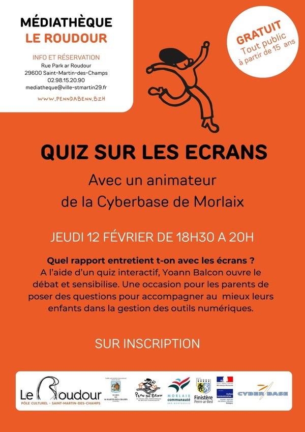 Gratuit, sur inscription auprès de la médiathèque au 02.98.15.20.90, Cette adresse e-mail est protégée contre les robots spammeurs. Vous devez activer le JavaScript pour la visualiser. ou sur le site https://www.penndabenn.bzh/agenda/quiz-sur-les-ecrans