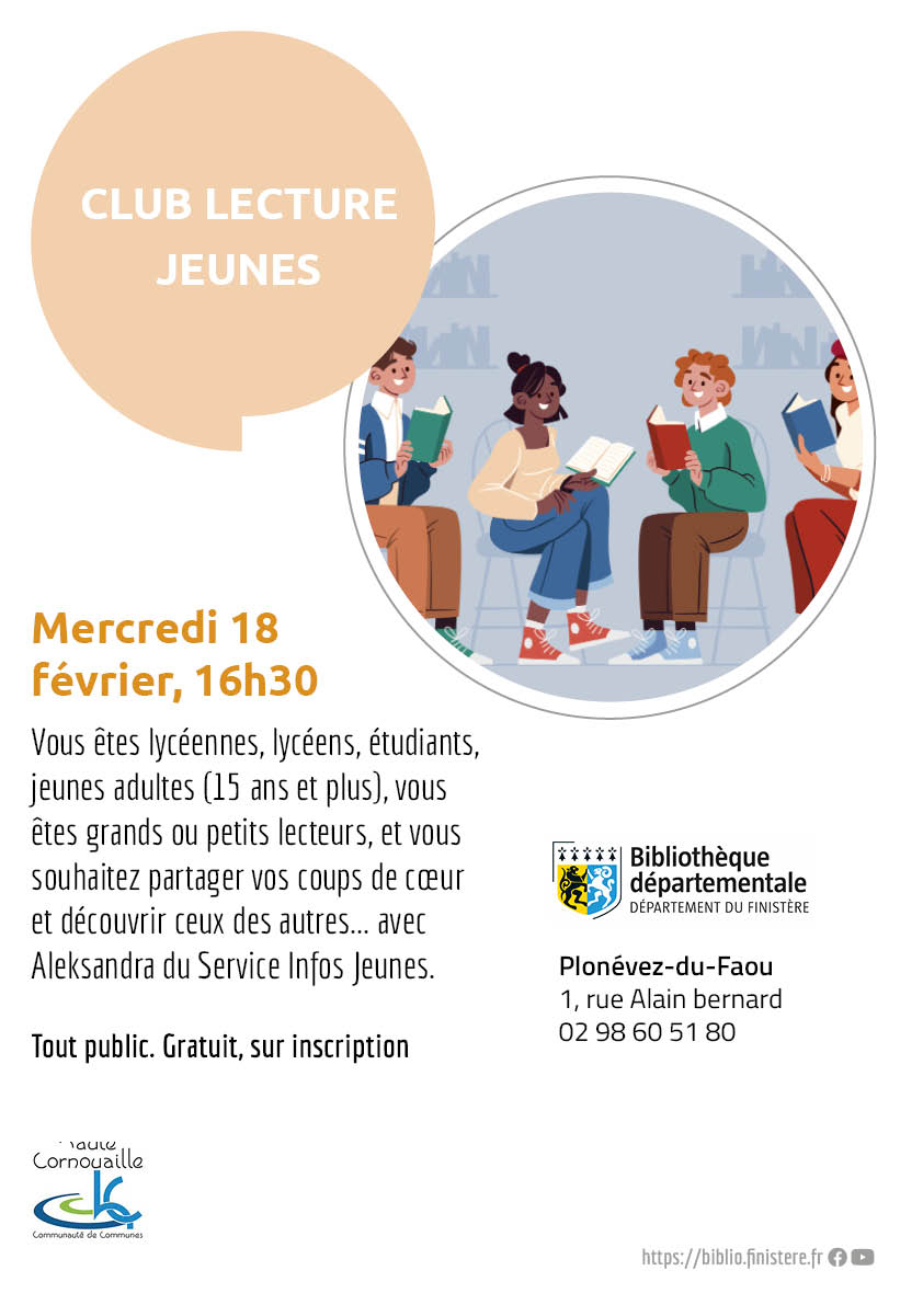 Club lecture jeunes Club lecture jeunes Le mercredi 18 février 2026 de 16:30 à 18:30 Ical Public Adultes Lieu Antenne du Pays COB - Plonévez-du-Faou Voir le détail de l'événement Tags Agenda