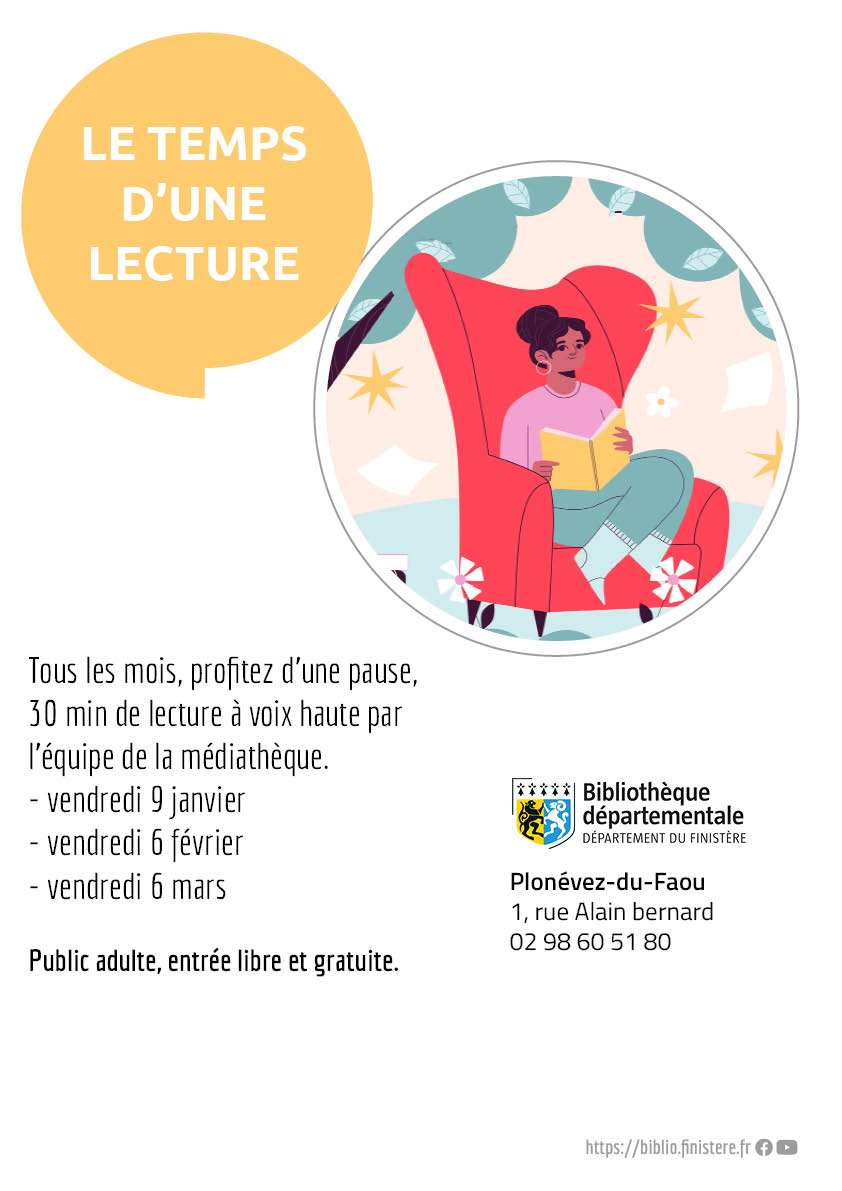 Le temps d'une lecture Le temps d'une lecture Le vendredi 06 février 2026 de 15:00 à 15:30 Ical Public Adultes Lieu Antenne du Pays COB - Plonévez-du-Faou Voir le détail de l'événement Tags Lecture